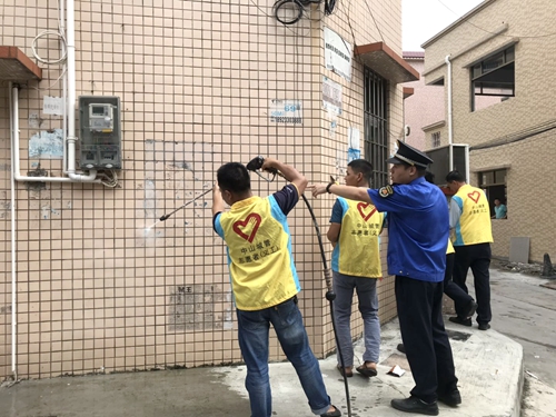 6月18日下午,港口执法分局携手城管志愿者对西街路周边墙上“牛皮癣”进行清理。